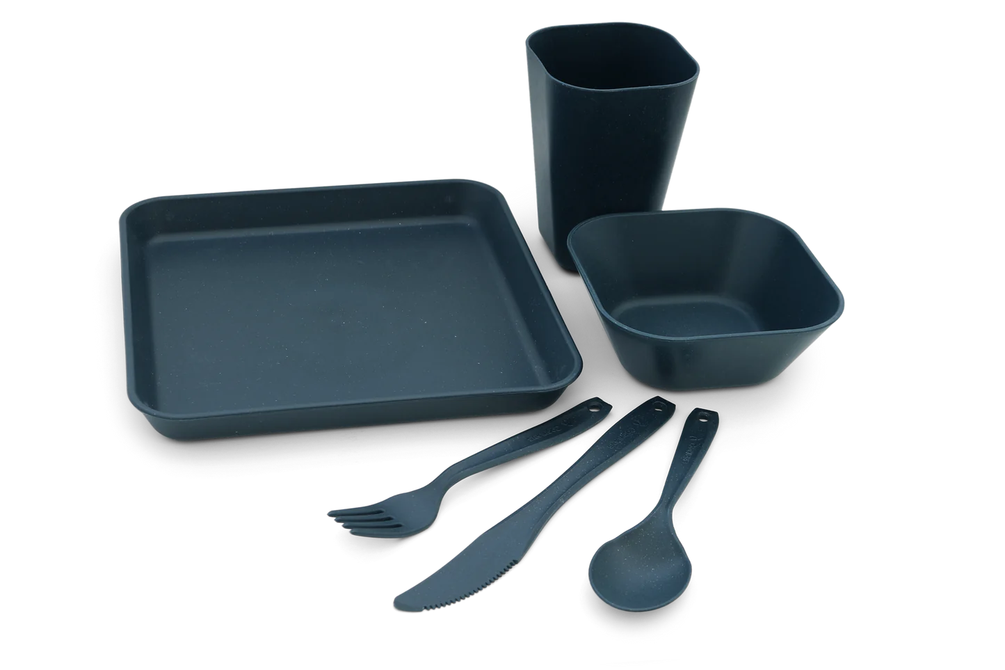 Kit individual contendo prato grande, tigela, copo, faca, colher e garfo contidos em uma bolsa telada para transporte. Livre de BPA é feito em Polipropileno bioinfundido com até 50% de palha de trigo. Lavável na máquina, leve, resistente e sustentável. Peso: 373g. Garantia 1 ano.