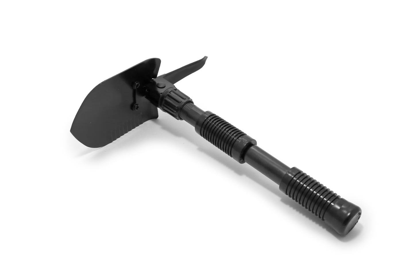 Mini Pá dobrável resistente e compacta com picareta integrada. Lâmina de aço forjado temperado com cabo e haste de metal. Possui colar de travamento positivo e bolsa de transporte de nylon Cordura preta.