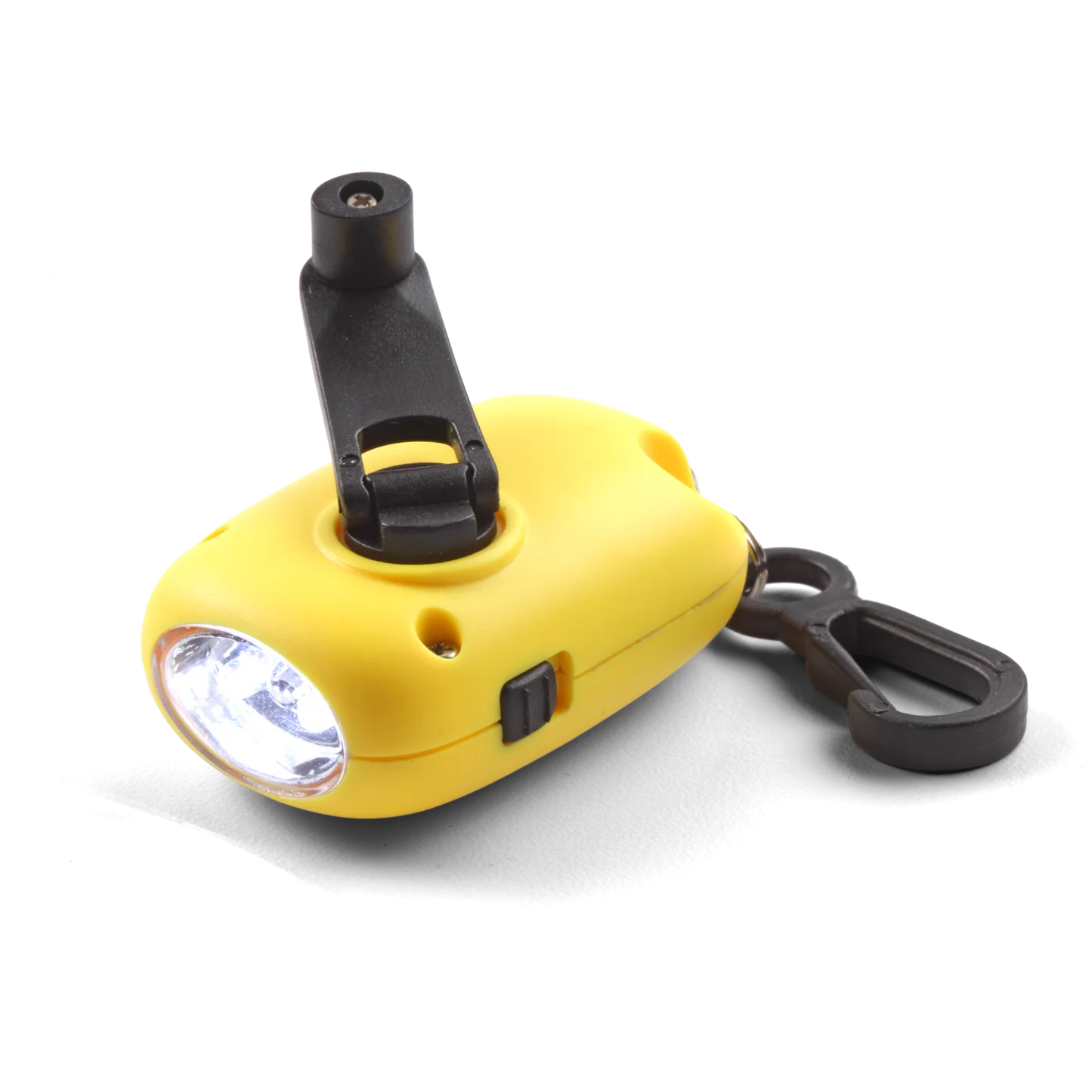 Lanterna LED compacta com tecnologia dínamo. Possui Dois LEDs com potência de 10 Lúmens, manivela dobrável e clipe para fixação. Girar por 1 minuto gera até 7 minutos de luz contínua. Nunca precisa de novas lâmpadas ou pilhas.