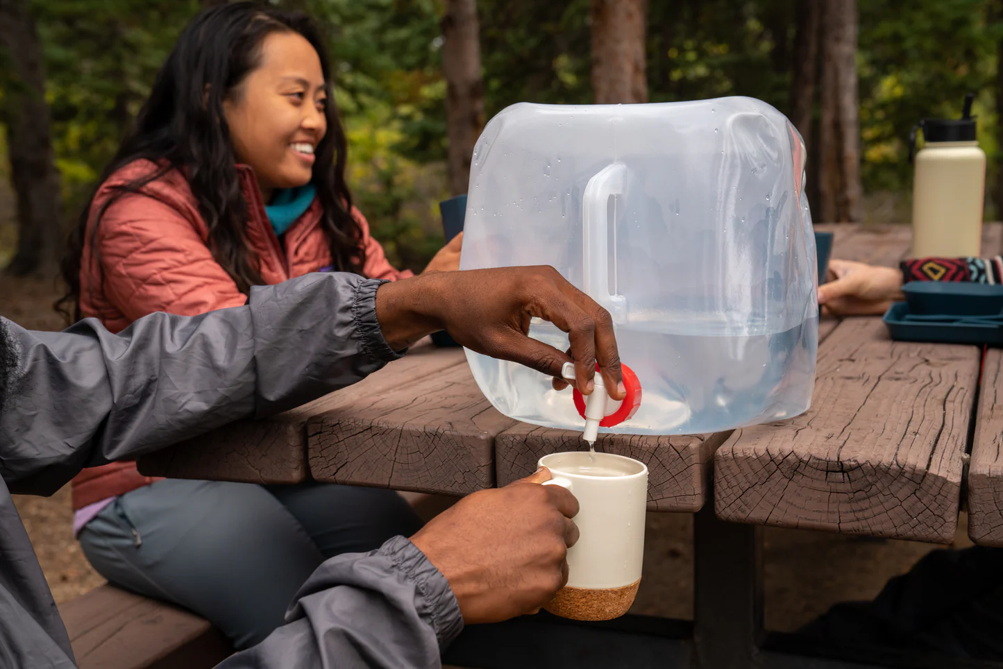 Recipiente de Água Dobrável com capacidade para 18,9L. Material Polietileno resistente, Livre de BPA. Possui Torneira liga/desliga à prova de vazamento e Alças para transporte.