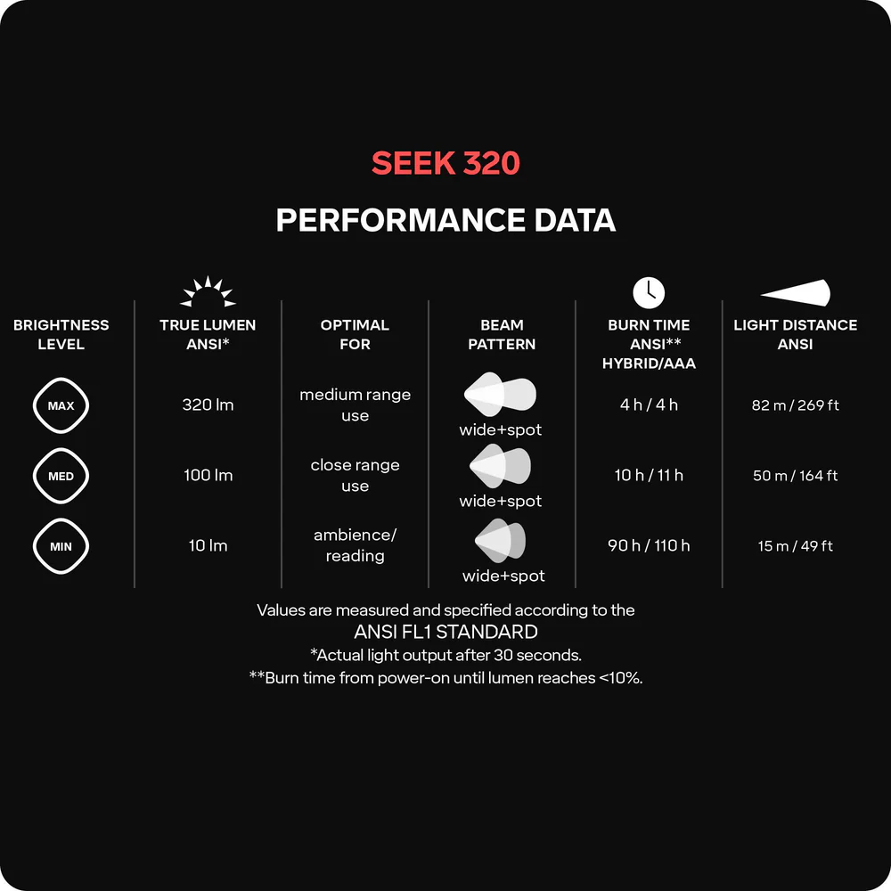 o Seek 320 é feito de plásticos reciclados e projetado para ser compacto e versátil. Ele oferece 320 lúmens com três níveis de brilho, incluindo um modo superbaixo de 10 lúmens para maior tempo de queima. A unidade de lâmpada removível pode ser montada em outros equipamentos, enquanto a Silva Intelligent Light combina holofote de longo alcance e holofote amplo. Tanto o farol quanto a bateria são resistentes à água (IPX5). Com a Tecnologia Híbrida, o Seek 320 funciona com a bateria híbrida recarregável Silva ou com pilhas AAA padrão (não incluídas).