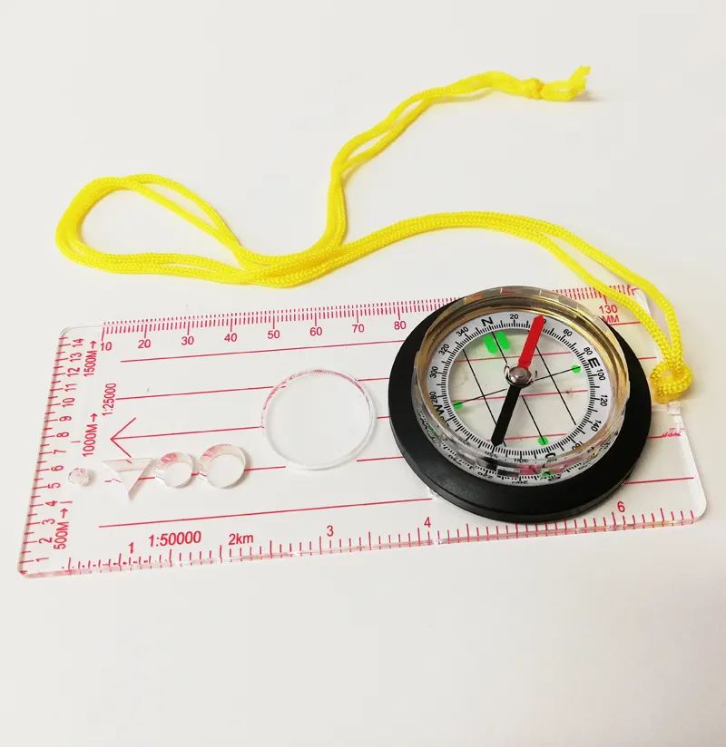 Possui pontos luminosos, lupa, seta de navegação, cordão de segurança para transporte, limbo móvel, régua de 140mm e escalímetros 1:25.000 e 1:50.000.