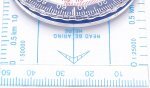 Possui base transparente em acrílico, limbo móvel 360º, seta de navegação, régua central de 5cm e escalas nas laterais 1:25.000 e 1:50.000.